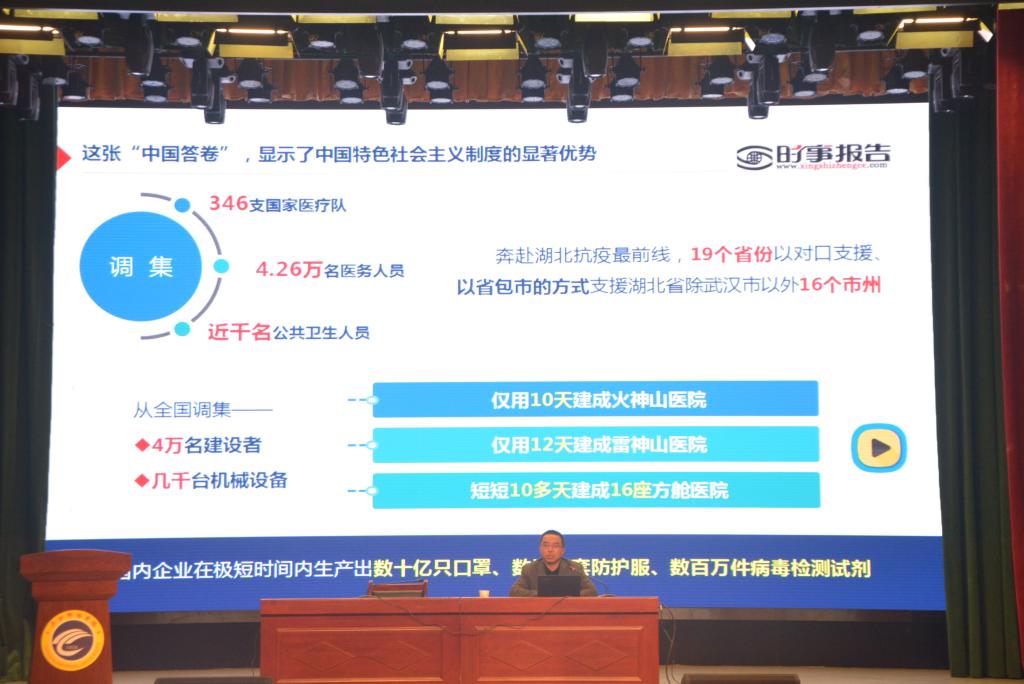 抗击新冠肺炎疫情的这张“中国答卷”.彰显着中国共产党的执政理念,记录着中国人民的艰苦努力,见证着中华民族的坚韧顽强,书写着命运与共的责任担当,历史不会忘记,人民永远铭记。通过此次报告会,我院学生深刻认识到,中国特色社会主义制度几乎在所有可比的领域都明显胜出,让学生增强“四个意识”、坚定“四个自信”、做到“两个维护”。