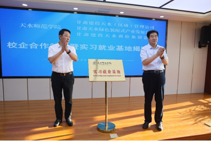 汪聚应一行先后参观了天水装配式建筑产业园PC(装配式混凝土结构)和PS(装配式钢结构)车间、天水体育中心等重点项目。随后双方就人才培养、校企合作等相关事宜进行了深入交流和座谈。汪聚应对学校的办学历史、办学条件、办学目标、师资队伍、人才培养、学科专业建设及校企合作等方面作了介绍,各部门负责人针对各自关心的校企合作问题与企业进行了深入交流。校长汪聚应希望在校企合作共赢的基础上,实现学校高质量内涵式发展,双方能够围绕人才培养、专业建设、“双师型”师资队伍建设、科学研究、成果转化、实习就业一体化等方面开展深度合作。甘肃建投天水(区域)管理公司董事长充分肯定了长期以来学校在人才培养方面做出的重大贡献,就单位的发展现状、企业理念、人才需求等作了详细介绍,着重从校企合作方向、联合培养、实习就业等方面作出具体说明,并表示将与学校建立长期合作关系,推动校企共赢发展。随后,王军与校长汪聚应分别代表校企双方签署合作协议,并一同为英国365“实习就业基地”揭牌。