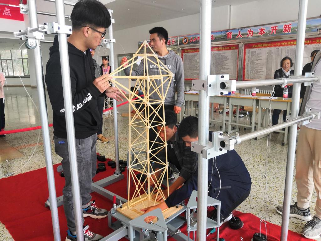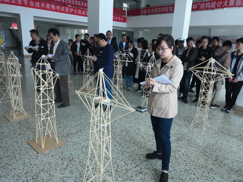 开幕式结束后在4号楼一楼大厅进行结构模型展览和加载试验。首先是专业教师和学生代表分别从模型的合理性、创新性、制作质量、美观性和实用性等几个方面进行评分;然后,各参赛队伍进行现场陈述,介绍结构的具体承载能力、加载点、结构的特点;最后是最激动人心的加载环节,通过加载仪器对模型的承载能力进行试验。整个加载过程中参赛同学们认真观察其他作品的表现,不断反思不足,取长补短,互相鼓励,都得到了很大的收获。