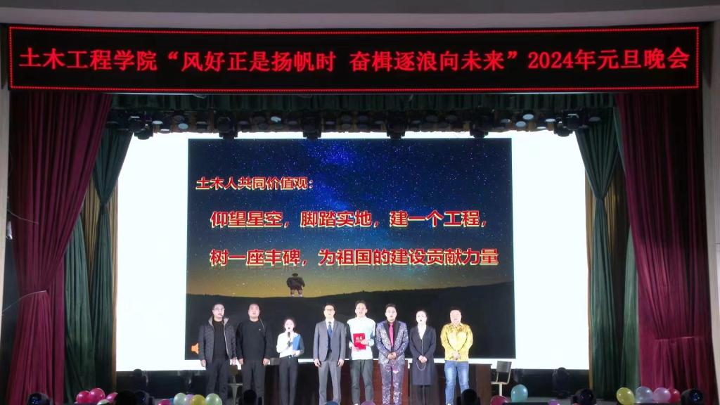在长达两个小时的时间里,土木工程学院学生用自己特有的方式,展现青春风采、表达新年祝福、寄予美好希望。此次元旦晚会的成功举办,展现了土木工程学院师生团结一心、积极向上的精神风貌,也为新年的到来增添了浓厚的喜庆氛围。2024年我们将迎来建校65周年、建院10周年的重要时刻,我院将在校党委的坚强领导下,全体师生团结拼搏、砥砺奋进,为学校更大建博和建设师范特色鲜明的高水平应用型大学做出更大贡献,为实现中华民族伟大复兴的中国梦培养更多优秀人才。