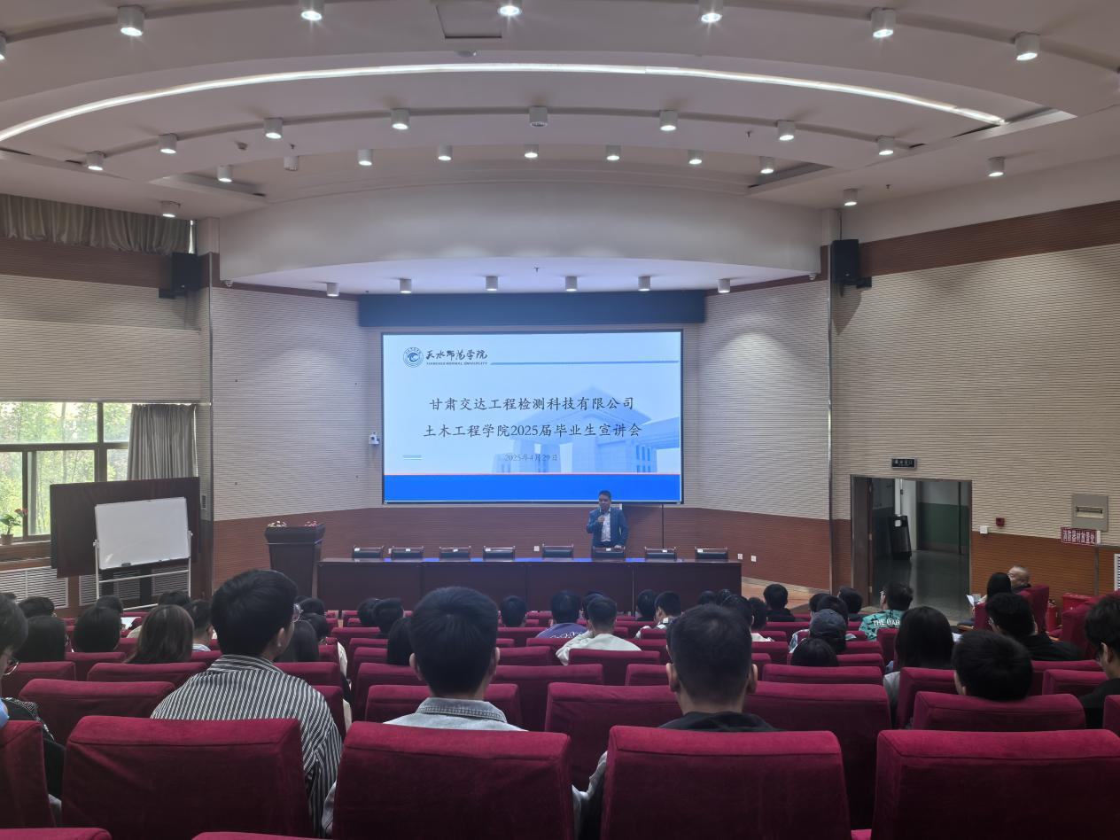 应土木工程学院邀请,甘肃交达工程检测科技有限公司周主任一行于2025年4月29日到英国365公司官网开展企业招聘宣讲,并在学校三号报告厅举办2025届毕业生专场招聘会。学院党委书记崔德旺,副书记、副院长周姣,辅导员及毕业班班主任参加招聘会,崔德旺作动员讲话。