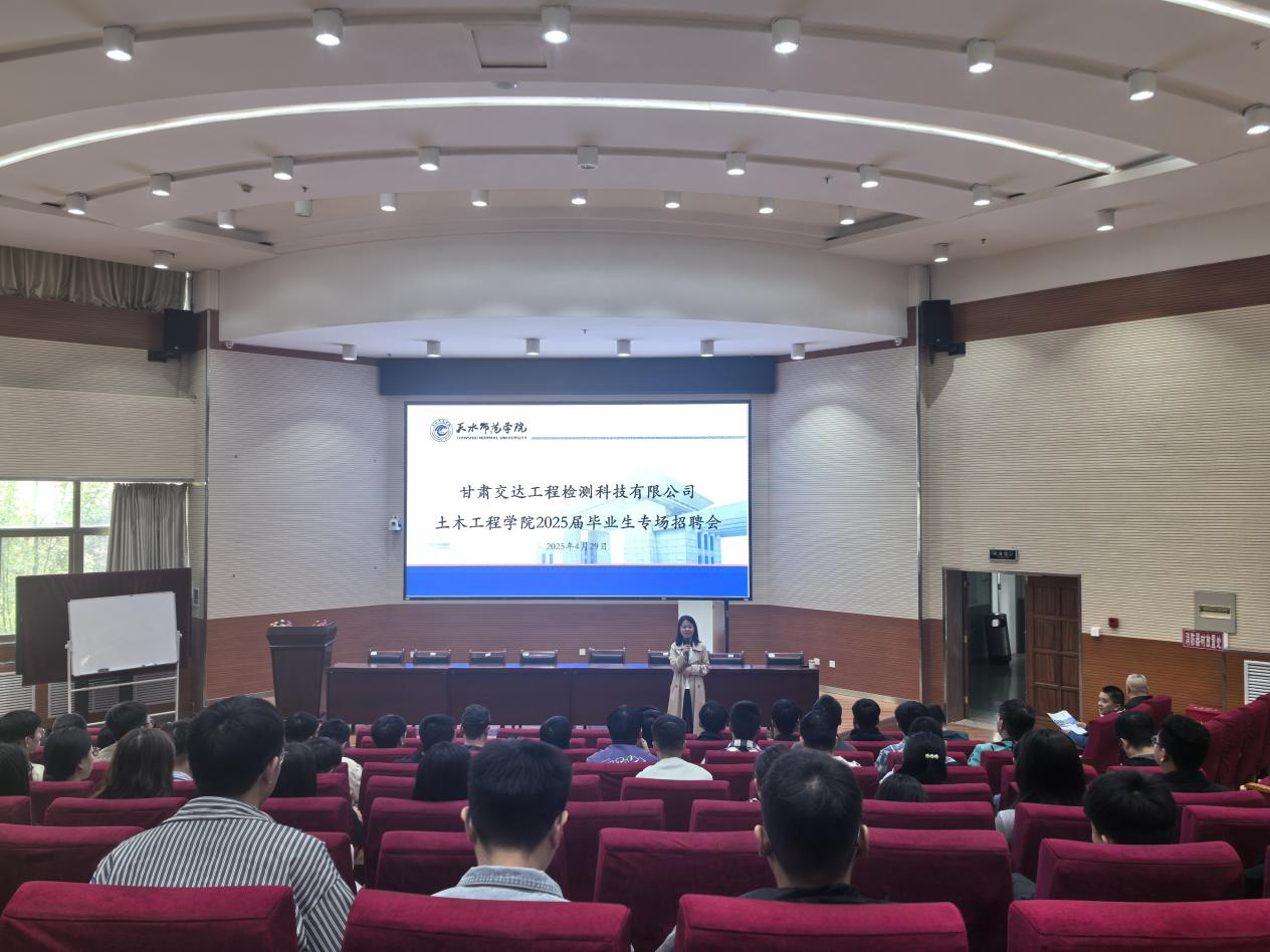 甘肃交达工程检测科技有限公司令叶莹做了宣讲,就企业概况、招聘岗位、薪资待遇等同学们关心的问题逐一进行了说明。本次招聘会学院积极组织80多名2025届未就业毕业生参加,现场气氛热烈。同学们热情高涨,认真准备简历,积极交流面试。此次招聘会赢得了全体师生的一致好评。
