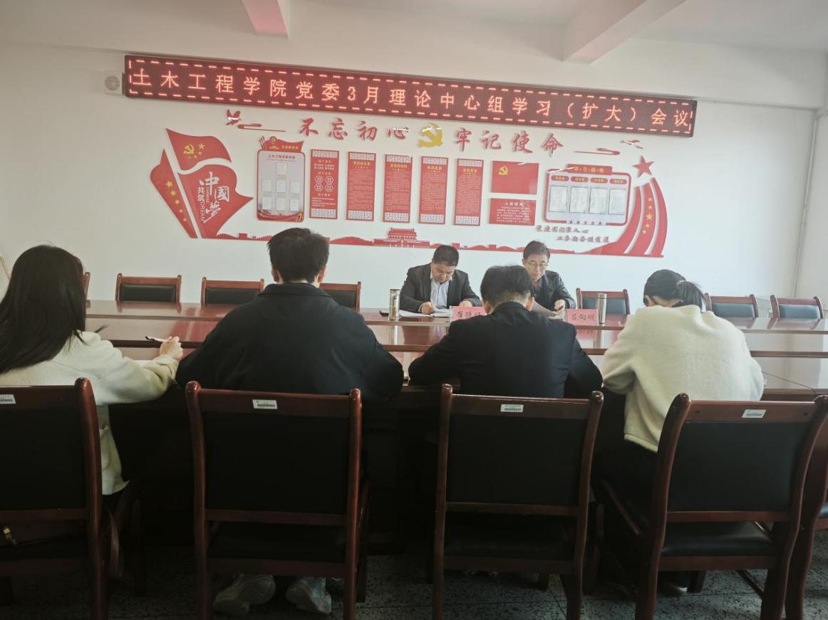 3月24日下午,土木工程学院党委在四号实验楼304会议室召开党委理论中心组学习(扩大)会议,安排部署开展深入贯彻中央八项规定精神学习教育工作。学院党委委员、各党支部书记、辅导员参加会议。会议由学院党委书记崔德旺主持。