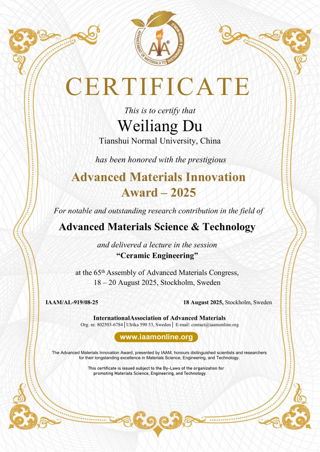 2025年8 月18 日至21 日,由(International Association of Advanced Materials,IAAM)主办的第65 届国际先进材料大( Advanced Materials Congress)在瑞典首都斯德哥尔摩举办。协会授予天水师范大学土木工程学院青年教师杜伟良2025年度技术创新奖(IAAM Innovation Award),以表彰其在陶瓷和复合材料领域做出的突出贡献。会议期间,欧洲科学院院士、中国工程院有效院士候选人、国家杰出青年基金获得者王清远教授为杜伟良颁发该奖项。